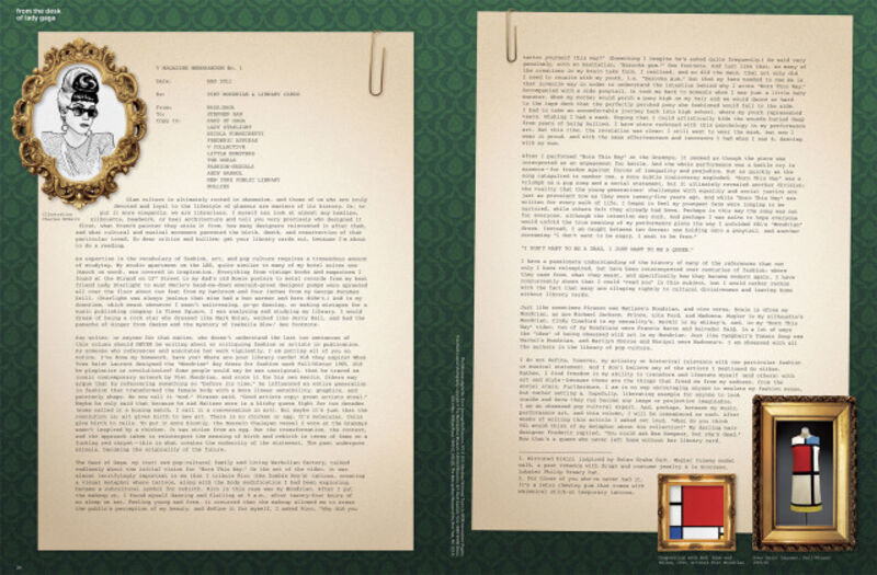 Pop music thingamajig Lady Gaga published her first V magazine column and boy is she trying to school readers. Not only do they get a lesson on how she came up with her "Born This Way" video, but also a lecture on art, fashion, and literature.