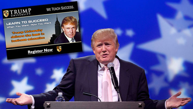 Moss-covered property troll Donald Trump may have sacrificed a presidential bid in order to better serve the Celebrity Apprentice-watching people, but that doesn't mean he'll stop giving of himself. The man just gives and gives! Wait, did I say gives? I meant "takes"—as in $35,000 per course at his institute of higher earning, Trump U.