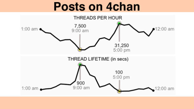 A study by grad students at MIT produced this chart describing the average activity on 4chan over a two-week span. Those familiar with the site will not be surprised that it really livens up in the off-hours.
