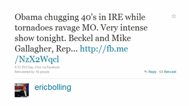 Earlier this week, Bolling provided some economic analysis of President Obama's trip to Ireland: "Obama chugging 40's in IRE while tornadoes ravage MO."