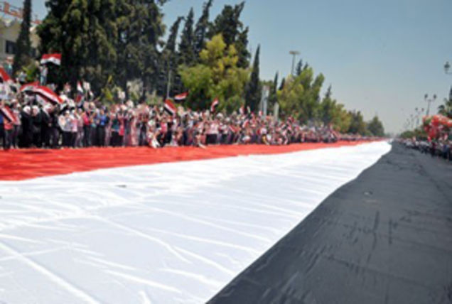 The regime of Syrian president Bashar al-Assad is celebrating the wholesale slaughter of civilians by throwing a kick ass street party, "Raise with us the Biggest Syrian Flag" today in Damascus. They've unveiled a huge flag just for the event: 2,300 meters long and 18 meters wide and sewn with the blood, sweat and determination of pro-Assad heroes. Luckily, state-run Syrian Arab News Agency had a "correspondent" on the scene, where emotions were running high: