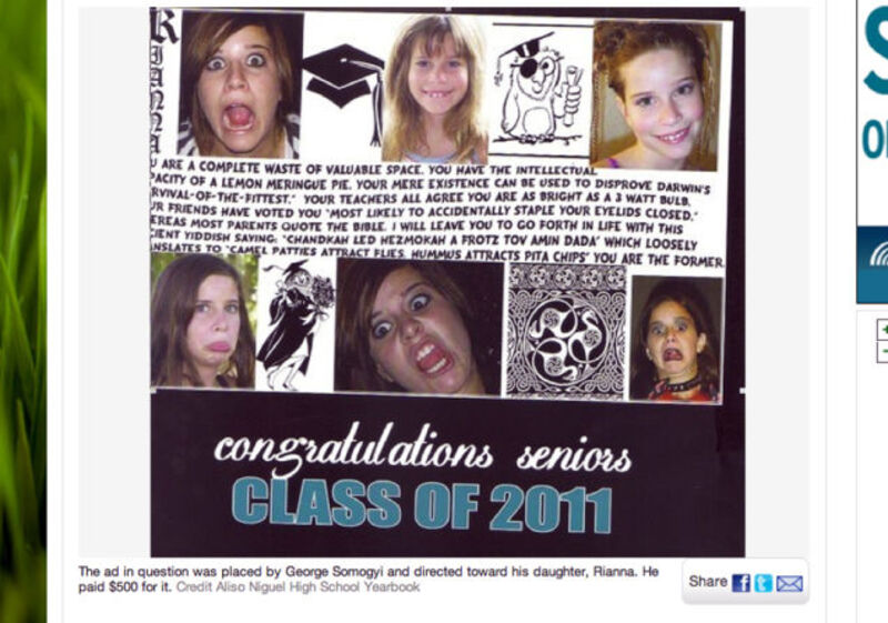 George Somogyi and his 17-year-old daughter Rianna "share a biting, sardonic sense of humor of the Monty Python variety." So dad figured he'd take out a $500 joke ad in his daughter's senior yearbook without telling her.