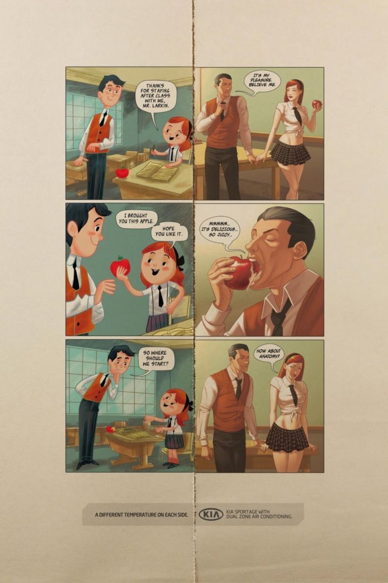 And here's one of the "Silver Lion" winners (click to enlarge): an ad for KIA that explains how dual-zone climate control is just like... um... fucking the teacher... if you weren't in elementary school. Yeah, I get what they were "going for," but... well. No point complaining now. This is an award-winning ad. Society will just have to catch up.