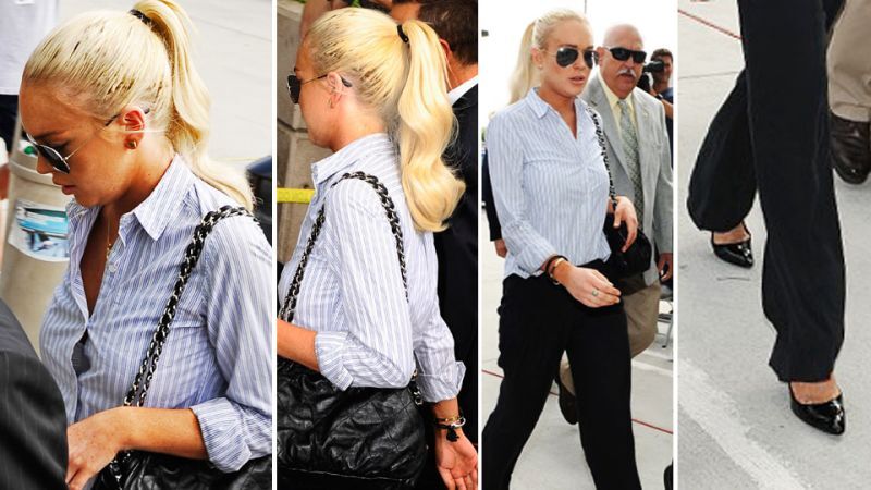 After testing positive for alcohol use during her house arrest following a neverending string of DUIs, probation violations, and an uncontested theft, Lindsay Lohan arrived in court today wearing her most conservative outfit yet: A blue striped button-down and black dress pants. But her bra showed anyway, in the gap between buttons. Modest clothes strain to fly off her body, like misaligned magnets repelling each other.