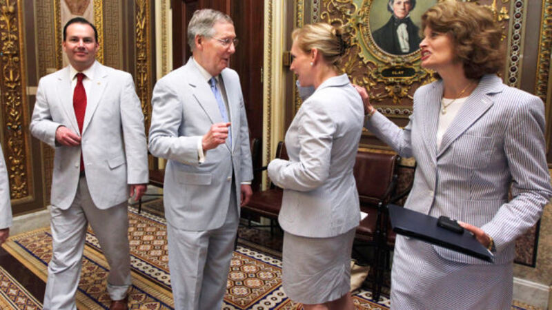 Red bowtie for men, white shoes. Ladies do not have to wear ties as they are ladies. In the photo up top, you can see Sen. Mike Lee wearing brown shoes today. This is incorrect. What the fuck is wrong with him? The classic example for Seersucker Thursday is Ben Nelson, 2007. It's the one thing he's ever gotten right.