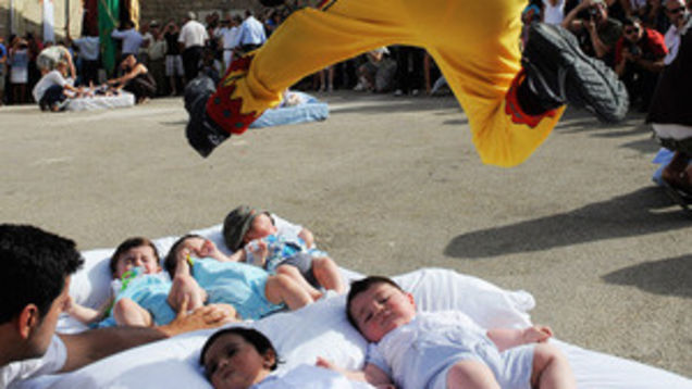 The ritual is said to cleanse the babies of original sin, and dates to medieval times. Babies born since last year's Salto del Colacho are eligible. Their parents arrange them on mattresses, where they lie in wait of absolution by leap. [Click image to enlarge]