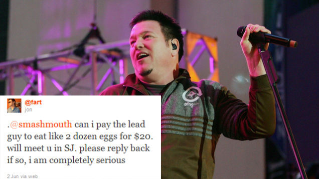 The campaign to make Smash Mouth's lead singer binge on hardboiled eggs for charity was launched, appropriately, by a Twitter user named Fart. That's Jon Hendren, a writer for web humor site Something Awful. Seems he and some folks from the Something Awful forums became fixated on Smash Mouth after noticing the band's sadly neglected verified Twitter account. (Even after the attention from the "Eat the Eggs" meme, it still has just 1072 followers.) I follow a bunch of these people on Twitter, and they began tweeting inexplicably about Smash Mouth and eggs a couple weeks ago. At the time it didn't seem strange, because these people inhabit a world of inside jokes so arcane it would take an anthropologist weeks of field work to understand most of them. Only now, reading the TMZ and the Huffington Post articles, has their ingenious scheme become clear.