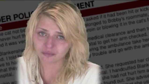Blankenship's boyfriend told them he'd called in the complaint (she'd struck him "because he wouldn't let her use his phone"), and that he'd witnessed her blowing "heroin smoke in the cat's face." The still-breathing cat was then brought to a veterinary hospital to be treated for poisoning.
