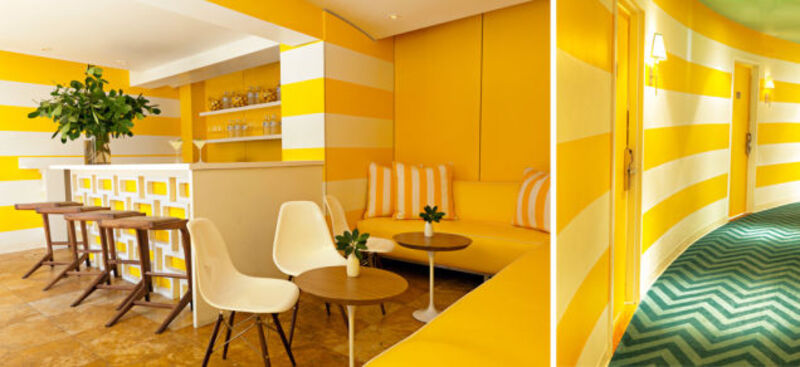 Given the splashes of beach-y yellows and aquas, guests might still be tempted to leave the shades on, but the hotel does capture what Gorman calls the "golden age of fun" and the outdoor-indoor feel of Miami. "It was supposed to be something spirited, happy, playful but definitely well designed that a discerning gay audience would appreciate, and something different than they've seen before," says Dan Mazzarini, who designed the 54-room hotel with his partner, Brian Humphrey. That "something different" includes unexpected touches like a glittery gold bar and a giant fake polar bear in the lobby, which has become a kind of mascot for the hotel.