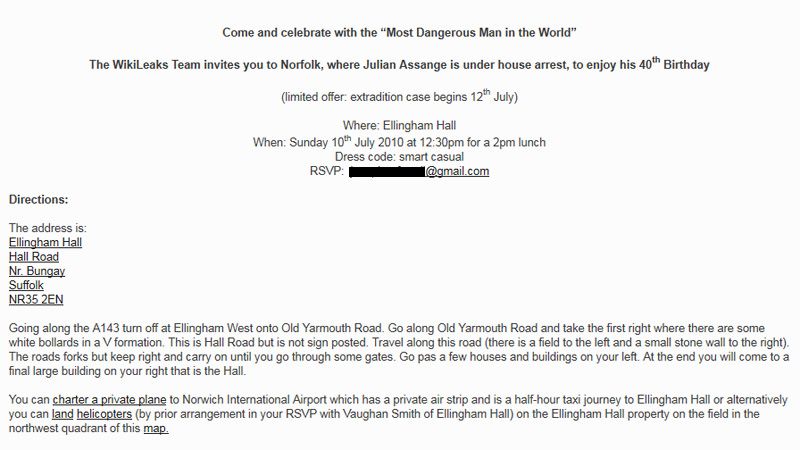 Unlike Angelina Jolie, Brad Pitt and Oprah, you weren't invited to Julian Assange's 40th birthday bash yesterday in Norfolk, England. Neither were we. But we've snagged an invite anyway. Here's a copy of the email sent to a few dozen of "The Most Dangerous Man in the World's" friends before the party.