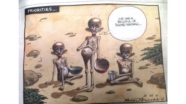 Rupert Murdoch's Times of London leveled a devastating charge today, via the cartoon above, at the reporters bent on getting to the bottom of News International's apparent vast criminal conspiracy: What about the children? Will somebody please think of the children? Or at least Britney Spears' farts? Anything but hacking, thanks.