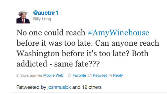 It must have been a long weekend for Missouri Rep. Billy Long, as he stared at the wall for hours at a time trying to to link the death of Amy Winehouse with our current debt ceiling debacle in 140 characters or less.