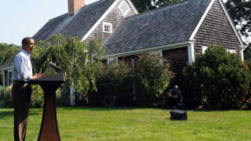 There has not yet been official confirmation that the Obamas are returning to Blue Heron Farm next week, but the White House Press Corps has booked a block of rooms at the nearby Mansion House just in case, and Secret Service agents have been spotted in the vicinity. It's thought the whole "economy swirling down the terlet" thing could curtail the president's vacation plans, if not postpone them entirely. [Politico, image via Getty]