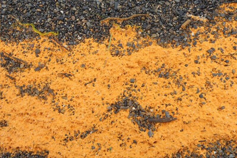 - Remember that mysterious orange goo that washed up on an Alaskan beach and nobody knew what it was except maybe it was some dark horrible force that signaled the beginning of nature's revenge against mankind's wretched environmental excesses? Well, scientists have now identified the goo as "millions of microscopic eggs filled with fatty droplets." Just your mom out for a swim.
