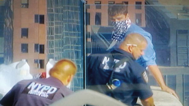 Thousands of New York tourists and office workers watched in horror on Wednesday afternoon as a distraught 23-year-old man dangled 70 stories above Rockefeller Plaza, threatening to jump onto the site of the famed skating rink below. The man wore "an American flag bandana on his face and...a tie," and had "several bags, one of which has a jug of water, and was handing policemen letters with...messages on them," Gothamist reports. Late Night with Jimmy Fallon bandleader Questlove also noted via Twitter, "holy lord—-why is this on the camera feed like in HD?!!?!?!?? like i can see his nose hair! wtf!," later adding, "Whew!!!!! They got him!!!!!!!!! Now beat his ass for ruining my lunch."