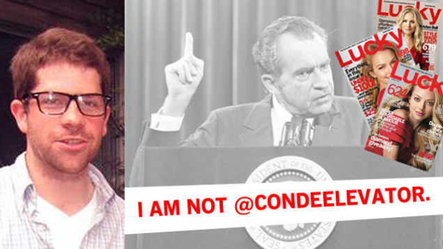 Lucky editor and accused Twitter parody mastermind John Jannuzzi has issued an official statement on the matter of an anonymous Twitter account dedicated to eavesdropping on people at Condé Nast: "I am not @CondeElevator." Then why did you accompany your statement with a picture of Richard Nixon, a known liar who once had a fake Twitter called @MarkFeltIsAShitNozzle, hmmm? [Lucky, Images via @JohnJannuzzi and Lucky]