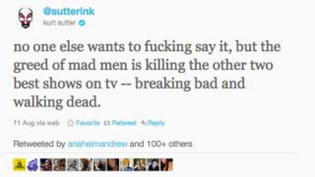 In the tweets, Sutter (who doesn't work for AMC, Sons is on FX, but I guess knows the biz anyway) accused Weiner of demanding so much money for Mad Men that its fellow AMC shows Walking Dead and Breaking Bad suffered.