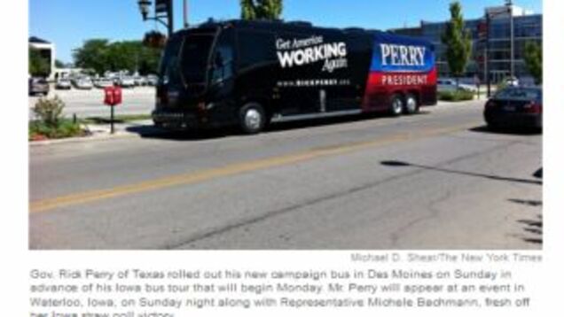 Joining the Tour de Grift Express, the Buss de Bachmann, and all the other Republican buses burning up fuel on America's highways this summer (don't worry, it's probably all biodiesel) is this sleek new model just unveiled by the Rick Perry campaign in Iowa. Grand!