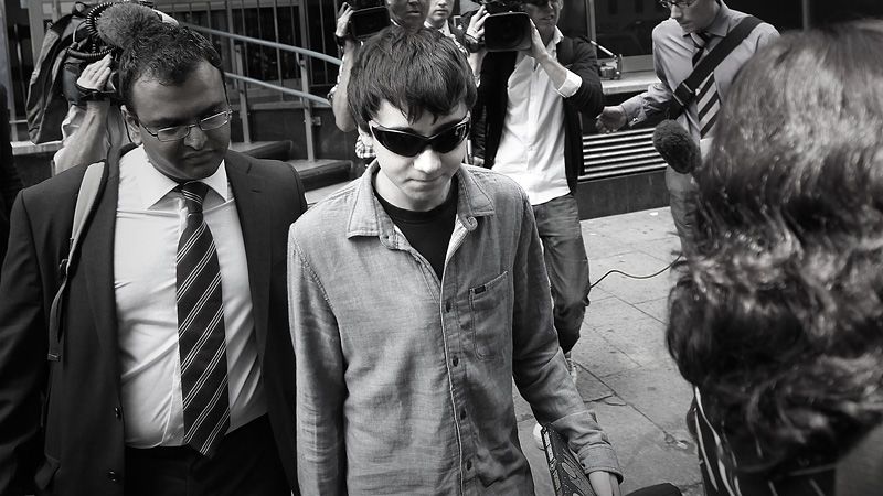 [Photos of Jake Davis outside a courthouse in London via Getty]