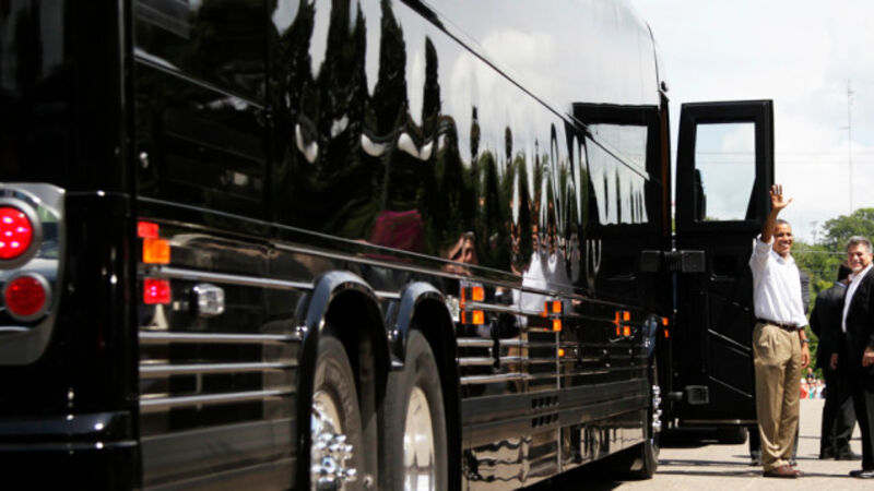 President Obama is not traveling around the Midwest in any old jalopy with "JOBS" or "AMERICA" splashed on the side. He's riding in a new pitch-black armored $1 million Secret Service bus. Why is he trying to scare all the people away?