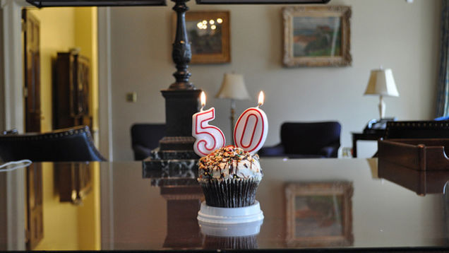 Well, this is somehow fitting. No 2,000-person parties. No Jennifer Hudsons singing "Happy Birthday." No staff cheeseburger outings. No, the other 50th birthday of note in the administration—that of bedraggled Treasury Secretary Tim Geithner—was observed with only a single cupcake, poised on a Starbucks cup, barely sturdy enough to support the "5" and "0" candles lodged into its modest crown of icing, sprinkles and crushed nuts. Hang in there, Franzy. [Flickr via Atlantic Wire]
