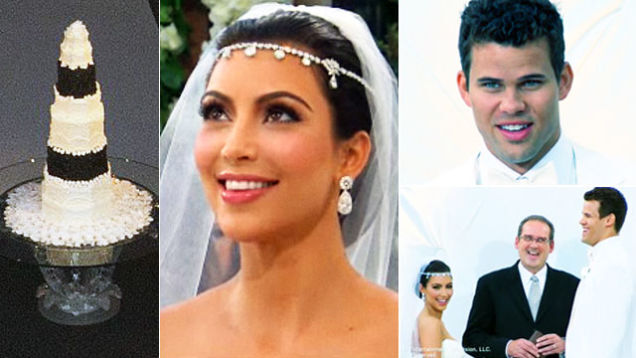 Anyway, here's the first "official" footage of the wedding, featuring a diamond-draped Kim jostling her cleavage against an extra-tight-faced Bruce Jenner, who walked her down the aisle. Looks like the guests were required to wear black and white, and to display 10 square inches of cleavage each. The decor matches the trashy-tattoo-themed plates in Kim's wedding registry. [THR, P6, Us, Us, Radar, ceremony images via E! video] - But really, the only thing that matters about Kim Kardashian's wedding is that the cake was a six-foot-tall butt plug. It cost an estimated $20,000. They'd have saved so much money if they put medium-sized humans up their butts, instead. [Us, cake image via Bauer-Griffin]