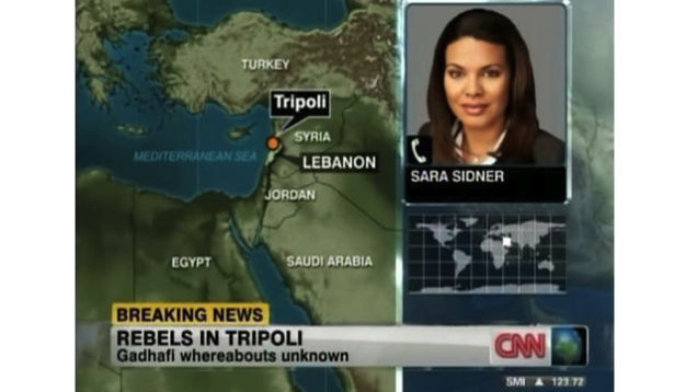 According to this CNN screenshot (apparently from Monday), Libyan rebels are advancing on Tripoli, Lebanon. Wrong continent, guys! They all do sort of look the same, if you are a 4th grader trying to pass her geography pop quiz.