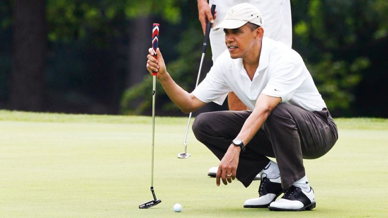 He stepped up to his ball, which was several feet from the hole, and made two practice strokes. He missed the hole on his first putt, but got it close. He then tried to tap it in, but missed again. He appeared to pick up the ball to let the others in his party play through as he watched.