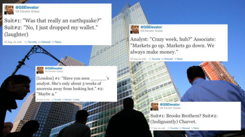 The golden age of anonymous corporate elevator Twitter accounts is ending. It lasted about a week. After @CondeElevator closed down operations because "This got really crazy. Love my job," a series of knock-off elevator Twitter accounts launched. The only worthwhile one was @GSElevator, tweeting overheard conversations from Goldman Sachs branches the world around. According to Page Six, the company's notorious rigid management has "kicked off an internal probe" on the matter. After reportedly trying—and failing—to get Twitter to freeze the account, Goldman is now "investigating who is behind it. They believe it is an intern or a young gun, but there are enough facts on the feed for bosses to suspect it is someone with access inside the company."