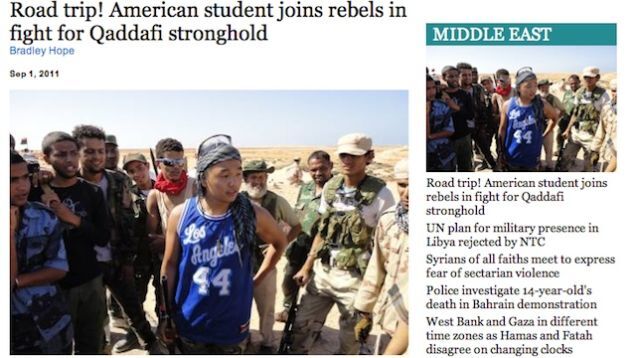 Jeon bought an $800 one-way plane ticket from L.A. to Cairo two weeks ago, then snuck across the boarder into Libya. He of course has no actual affinity for the rebels: "At spring break I told my friends a 'sick' vacation would be to come here and fight with the rebels," he told a Christian Monitor reporter. And he is about as good a soldier as you would expect, according to the National: