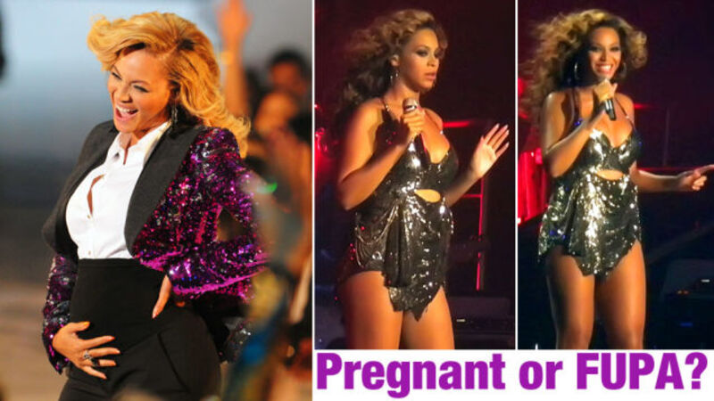 But unless that's a giant sequined FUPA, I'm inclined to say she looks pregnant there, too? As for the grainy Croatian vacation picture at right, note that higher-quality pictures from the same vacation show Beyonce in a bikini, sizable belly exposed.