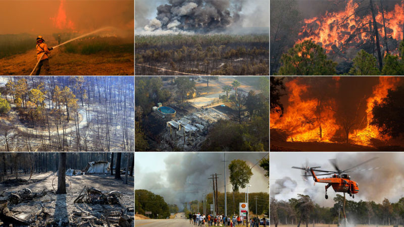 It's been a horrible year for wildfires in Texas—six of the state's ten largest recorded wildfires have come in the last eight months, and nearly 3.5 million acres have burned so far. Right now, a large fire in Bastrop State Park—near Austin—rages completely out of control, and another in Montgomery County has forced 4,000 to evacuate, destroyed 80 homes, and likely caused the cancellation of a Renaissance Fair. Here are some breathtaking photos of the fires, and the damage they've caused—including a video taken from the International Space Station.