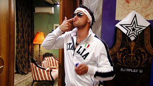 For some reason or another, Deena decides she wants to do DJ Paulie Depilatory's hair. He actually lets her, which is a huge step for a guido male, since they're not used to having a woman come anywhere close to their heads. Deena fashions it into a faux-hawk, the most hackneyed style in all of America (only because the Euro Mullet has never caught on across the pond). DJ Paulie Departure decides that this haircut doesn't belong to him, but a whole new character, a "guido toolbag" named Tony D. He then decides to transform Vinny into a equally stereotypical guido named Louie. Together they put on quite a show.