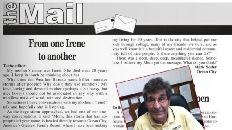 "Why does the Weather Bureau name killer, monster storms after people?" asks Mark Soifer, son of Irene, poobah of Ocean City, New Jersey. "My kind, loving and devoted mother (perhaps a bit bossy, but nice bossy) should not be associated in any way with a mindless mass of wind, rain, and destruction."
