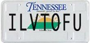 Tofu-loving Tennesseean Whitney Calk has teamed up with PETA to protest being denied a vanity license plate that says ILVTOFU (I love tofu) because state bureaucrats misread it as I LV TO FU, which they found offensive, because fucking. Which is odd, since I find tofu more offensive than fucking, but that's beside the point.