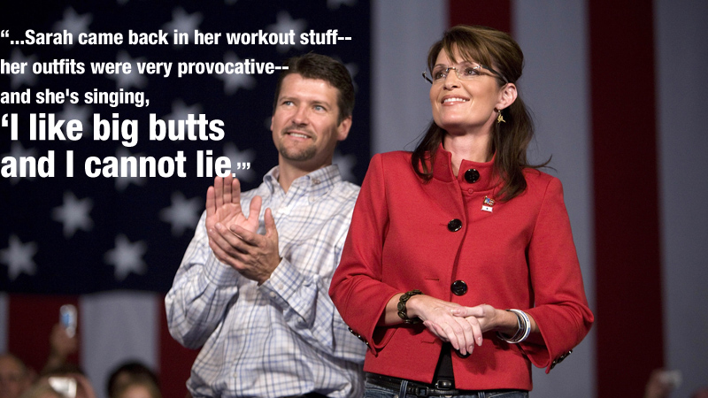 The men agreed. But that didn't work either. "You guys are so big," the instructor said, "that when you're in the front of the room you block everybody's view of me." ...A friend offered a different perspective. "One morning," she told me during the summer of 2010, "Sarah came back in her workout stuff— her outfits were very provocative— and she's singing, 'I like big butts and I cannot lie,' and she's dancing around the kitchen. Todd comes in from the garage, and Sarah starts going on about how the guys are checking her out at the workout place. The way she's saying it is totally antagonizing Todd, and he finally says, 'Well, why don't you put some fuckin' clothes on?'"