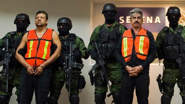 But! The news from the front line in the War on Drugs isn't all "mass graves in the middle of the highway." On Tuesday, police arrested Saul Solis Solis, a leader in the Knights Templar cartel. (That's him above with fellow alleged gang member Mario Alberto Gordillo.) Solis got his start in the drug economy on the other side of the equation—as a police chief and congressional candidate—and was arrested today "without incident." So with this guy behind bars, the War on Drugs should be over by Thanksgiving or so?