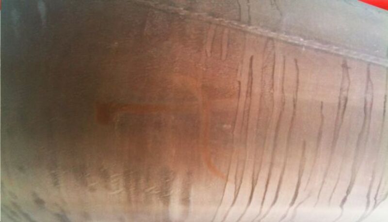 Press reports have said the marks appear to have been "etched using a chemical process." But our tipster says, "To me they look less etched and more wiped on with grease."