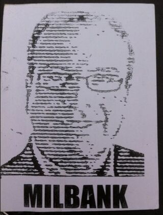 Yeah, so it's basically an OBEY-style sticker of Washington Post humor hack Dana Milbank's face and last name, which has been plastered around the city lately. The anonymous sticker bombers tell the Washington City Paper: "We thought his image would foster discussion about journalism, marketing and the trend toward super-local news."