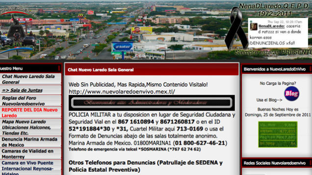 The victim, Marisol Macias Castaneda, was a newsroom manager for Primera Hora, a newspaper for the border city of Nuevo Laredo. But it was her activity on the site Nuevo Laredo en Vivo, or Nuevo Laredo Live, that seemed to be the source of her murder. The site "prominently features tip hotlines for the Mexican army, navy and police," the AP reports, and "includes a section for reporting the location of drug gang lookouts and drug sales points."