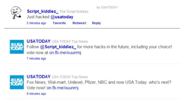 The hacking group The Script Kiddies took over USA Today's verified Twitter account for a few minutes on Sunday. All they did was tweet some requests for people to "like" them on Facebook, as if they were a new brand of organic snack food or something. The Script Kiddies have a history of wasting opportunities: When they hacked NBC News' Twitter on September 9th they tweeted unfunny, barely-legible fake reports about a terrorist attack on Ground Zero.