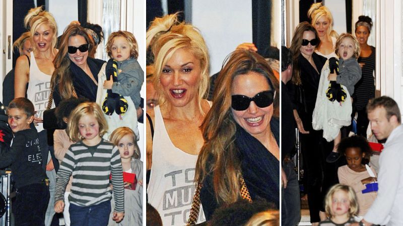Behold, a play date that will make a thousand social-climbing mommies seethe with envy: Angelina Jolie brought her brood to Gwen Stefani's London home today, for a play date and dinner. Looks like Kingston and Shiloh got into one of their moms' makeup kits?