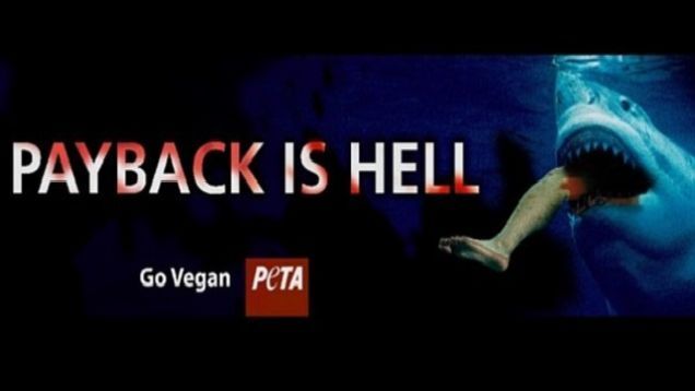 The ads, titled "Payback is hell," are supposed to promote veganism and also sensitivity to fish. They're inspired by the recent experiences of Florida fisherman C.J. Wickersham, who was fishing with his friends when a bull shark went and bit him in the thigh, causing a 15-inch gash and exposing his thigh bone. Wickersham deserved to be attacked, because he was attacking the fish. Hopefully he's spent his time in intensive care coming to terms with his behavior and shaking down hospital staff for PETA funds that the organization can use to create more ads making fun of him.