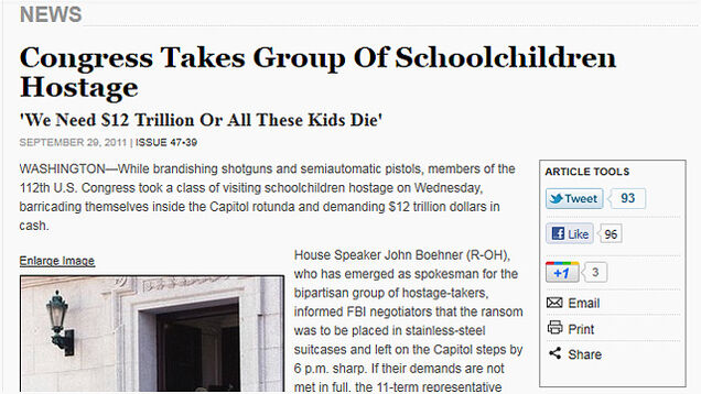 This, by itself, was not funny at all and many people, including me, believed the account might have been hacked. Either way, no big deal: It's still fake! The Onion followed up a minute or two later with: "BREAKING: Capitol building being evacuated. 12 children held hostage by group of armed congressmen." This made it clear the tweets were related to a story on the Onion's website "Congress Takes Group of Schoolchildren Hostage," satirizing the budget fight—an article about as offensive as anything on the Onion any day.