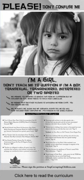 The ad shows a cute little girl (well, cute by Canadian standards at least) and says she doesn't want to be confused and think that she's a boy because she's taught about gay people and transgender people in school. Yeah, that's exactly what turns kids into gay people and gives them gender dysmorphia. That's it. I mean, I didn't turn gay until my High School geometry teacher Mr. Roy—well, she was only Mr. Roy after the surgery, but before he was Ms. Roy, the girl's tennis coach—showed RuPaul's "Supermodel" video in class one day to teach us about conical structures. Now, I'm gay! And I don't know what gender I am! No, I'm just kidding. Having a transgender teacher won't hurt you. Those kids from South Park have a teacher that underwent gender reassignment surgery and they're still OK.