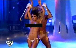 I'm not entirely sure why Cinthia Fernandez ended up naked on Bailando por un Sueño, but here she is, completely nude. She starts the dance off in a racy outfit with her toga-clad partner. It's some sort of Roman orgy scene, but with only two people. What follows is less of a dance and more of a mutual strip tease, where Frenandez and her partner pull off each others clothes revealing skimpier and skimpier outfits while they writhe and contort around the stage. By the time she is grinding in his lap while he pours wine over her naked body it's something that even Nomi Malone in Showgirls would find over the top. She's only wearing a G-string and he's in his Speedo and just when you thought it couldn't get any crazier, he whips off her panties and she is standing there, on national television, completely naked. It's something to behold!