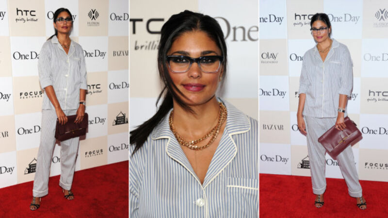 But since French fashion house Celine and Tommy Hilfiger are putting pajamas on the runway and usually tasteful designer Rachel Roy (see above) was wearing them on the red carpet just last month, girls who use the word "fashionista" are going to start giving it a try, including our intrepid reporter.