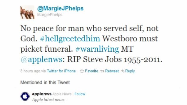 God Hates Steve Jobs about as much as God Hates Fags, but God loves Apple products—therefore, it's totally not hypocritical at all that Westboro Baptist Church member @MargieJPhelps used an iPhone to declare her congregation's next publicity stunt demonstration on God's behalf. Even God has an iPhone.