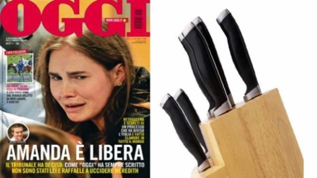 The latest issue of the Italian gossipy mag Oggi features a cover story on Amanda Knox and her acquittal on stab-murder charges last Monday, plus a free set of knives and a pizza cutter. Clever.
