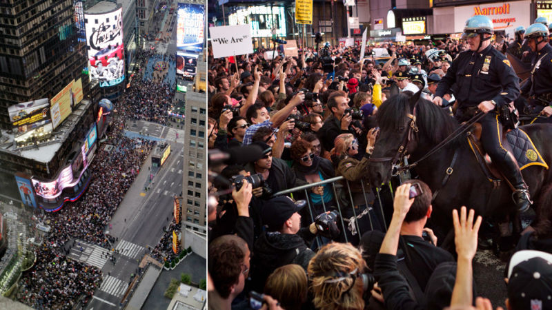 Of the 74 arrested in New York, 42 were arrested at Times Square and another 24 at a Citibank in Greenwich Village. (Apparently another five were arrested for wearing masks.) Two NYPD officers "suffered minor injuries in the chaos" in Times Square. The protesters had marched from Zuccotti Park in the late afternoon, stopping in Washington Square Park along the way and arriving in Times Square by 5, where they were greeting by a large crowd of police (some on horseback), not to mention a few tourists: